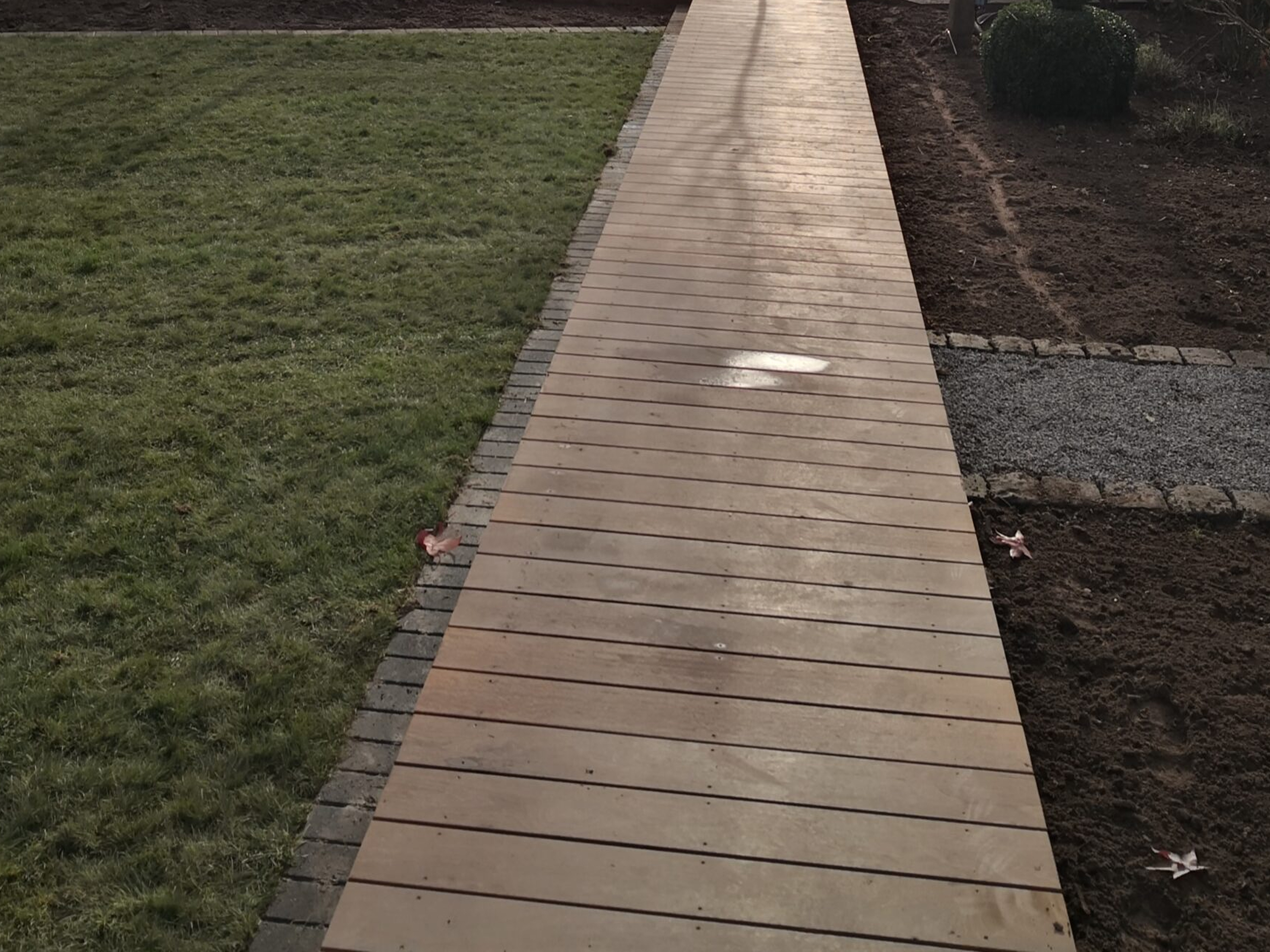 Fertiggestellter Gartenweg mit Holzbelag und Pflastereinfassung als Teil einer Gartengestaltung in Bad Segeberg.