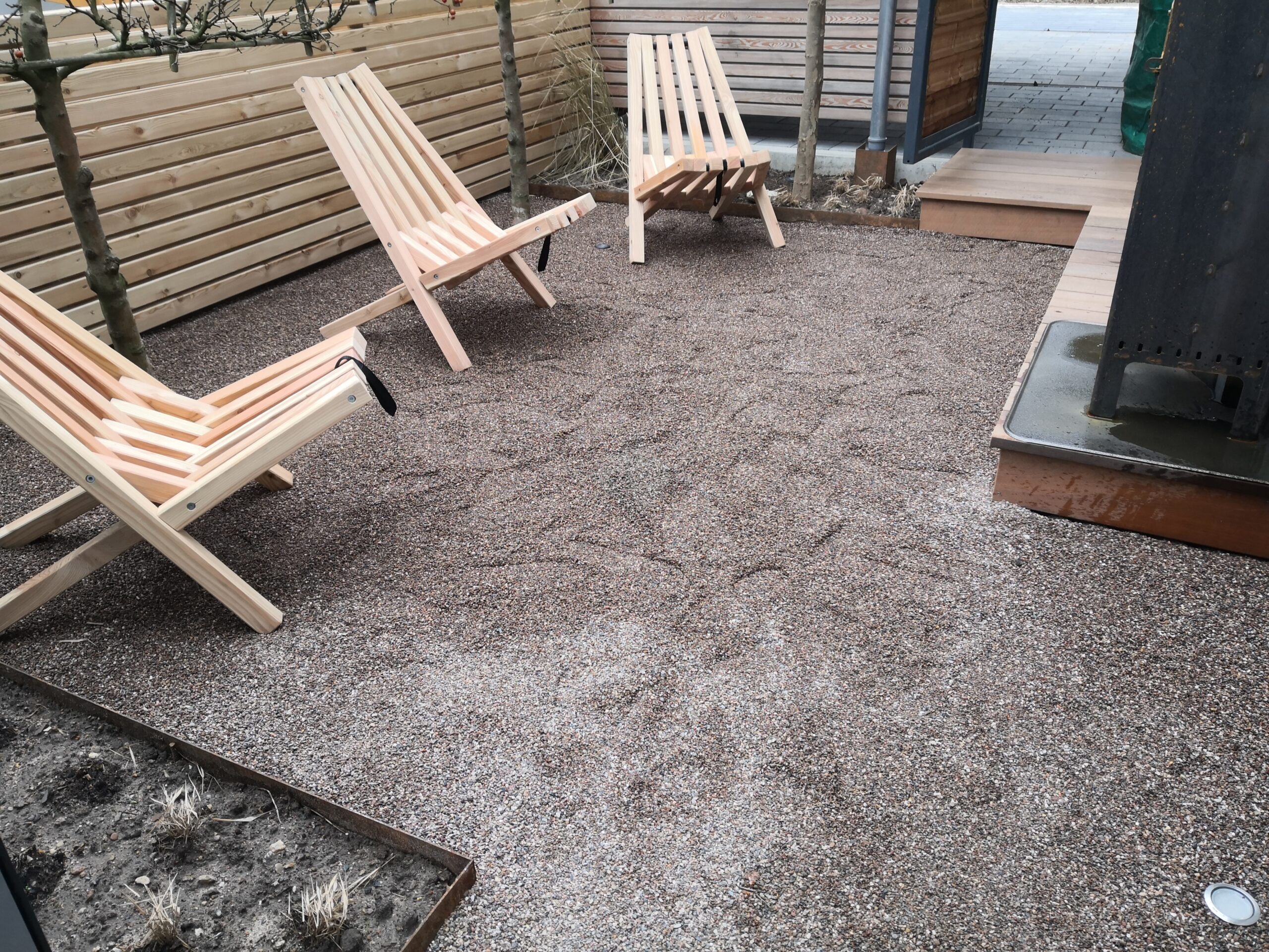 Gestalteter Sitzbereich mit Kiesfläche und Holzsichtschutz als Teil eines Garten- und Landschaftsbauprojekts in Bad Segeberg.